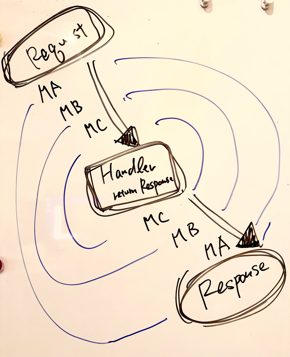 我们把返回 Response 的原语称为“处理器(Handler)”。 “中间件”在处理器之前或之后执行,用来处理 Request 与 Response, 结构就像一层层洋葱。